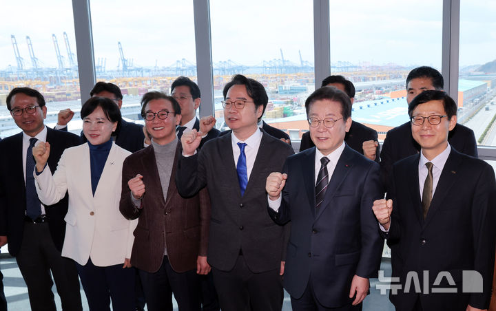 [부산=뉴시스] 하경민 기자 = 이재명 더불어민주당 대표가 6일 부산 강서구 부산항만공사 부산신항지사 부산항 홍보관을 방문, 부산시 및 부산항만공사 관계자 등과 기념사진을 찍고 있다. 2025.03.06. [email protected]