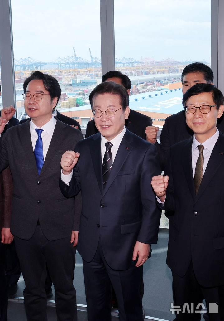 [부산=뉴시스] 하경민 기자 = 이재명 더불어민주당 대표가 6일 부산 강서구 부산항만공사 부산신항지사 부산항 홍보관을 방문, 부산시 및 부산항만공사 관계자 등과 기념사진을 찍고 있다. 2025.03.06. [email protected]