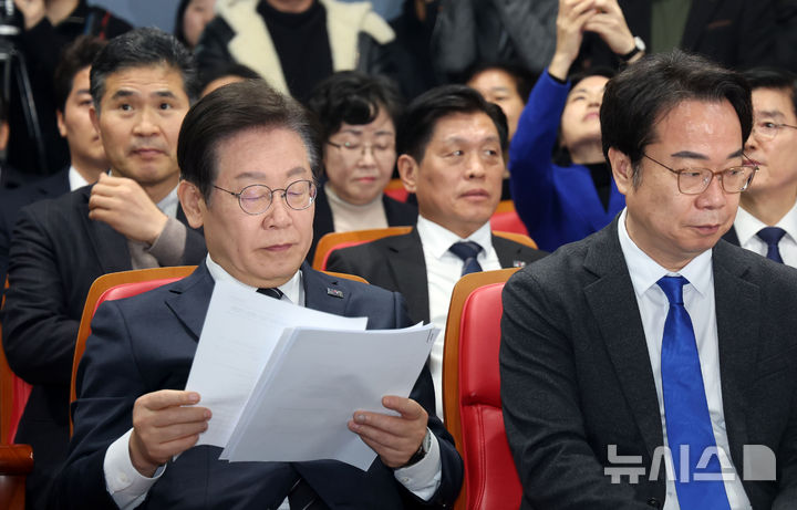 [부산=뉴시스] 하경민 기자 = 이재명 더불어민주당 대표가 6일 부산 강서구 부산항만공사 부산신항지사 부산항 홍보관을 방문, 부산시와 부산항만공사의 부산신항 활성화 및 북극항로 개척 추진상황 설명자료를 살펴보고 있다. 2025.03.06. [email protected]