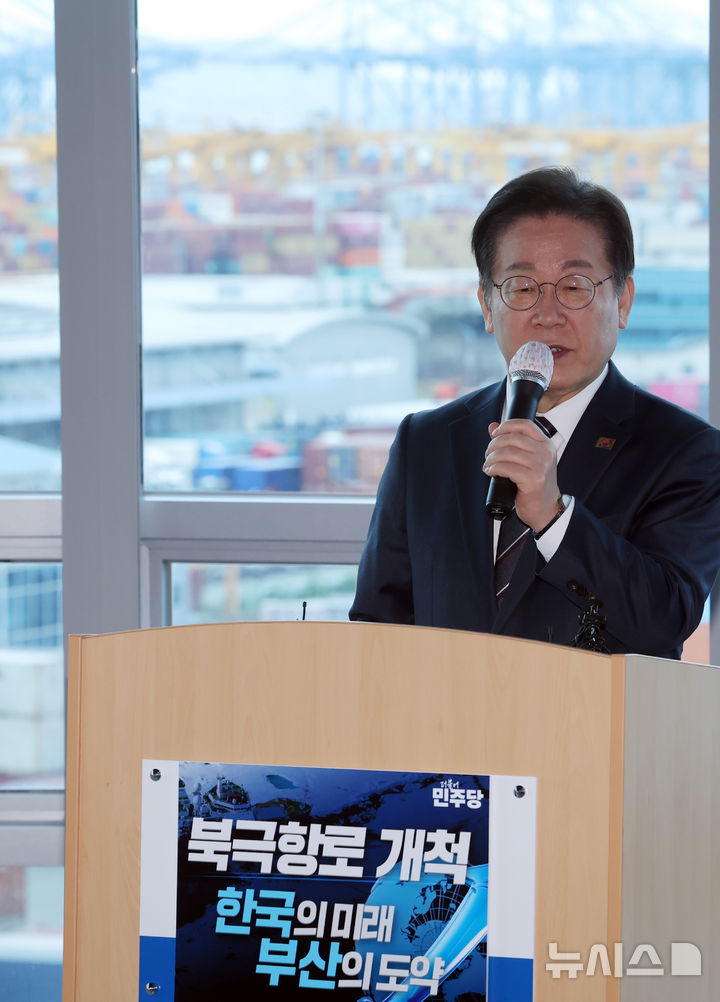 [부산=뉴시스] 하경민 기자 = 이재명 더불어민주당 대표가 6일 부산 강서구 부산항만공사 부산신항지사 부산항 홍보관을 방문, 부산시와 부산항만공사의 부산신항 활성화 및 북극항로 개척 추진상황에 대한 설명을 들은 뒤 발언하고 있다. 2025.03.06. [email protected]