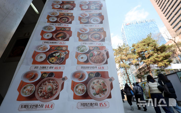 [서울=뉴시스] 추상철 기자 = 6일 오후 서울 중구 명동의 한 음식점 앞에 각종 음식 메뉴 가격이 안내되고 있다.