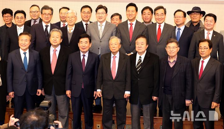 [서울=뉴시스] 조성봉 기자= 정대철 대한민국 헌정회 회장을 비롯해 참석자들이 6일 오후 서울 여의도 국회 도서관 대강당에서 열린 '분권형 권력구조 개헌 대토론회'에서 기념촬영을 하고 있다. 앞줄 왼쪽부터 손학규 전 민주당 대표, 김무성 전 새누리당 대표, 김진표 전 국회의장, 권노갑 김대중재단 이사장, 정대철 헌정회 회장, 김덕룡 김영삼민주센터 이사장, 정균환 민주화추진협의회 의장. 2025.03.06. [email protected]