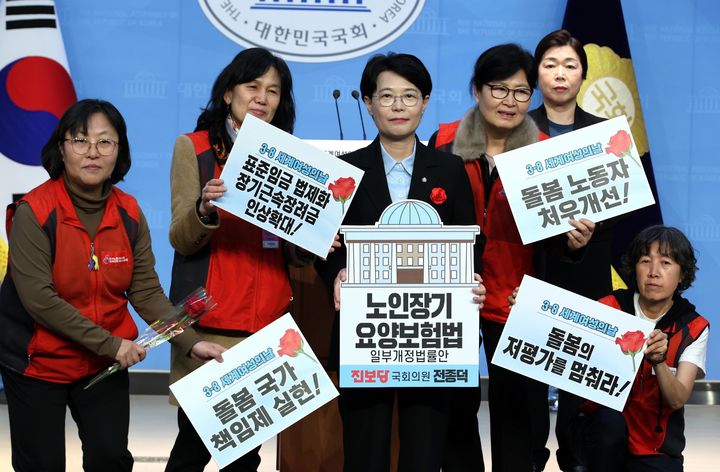 [서울=뉴시스] 조성봉 기자= 전종덕(가운데) 진보당 의원과 돌봄노동자들이 6일 오후 서울 여의도 국회 소통관에서 열린 노인장기요양보험법 발의안 설명 및 여성의날 관련 기자회견에서 퍼포먼스를 하고 있다. (사진=전종덕 의원실 제공) 2025.03.06. [email protected] *재판매 및 DB 금지