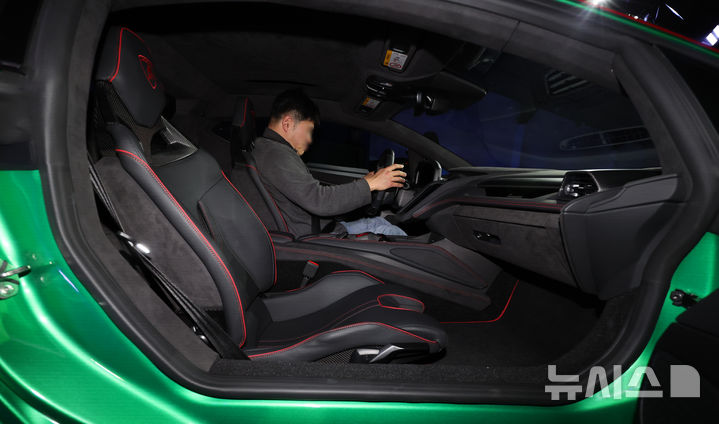 [서울=뉴시스] 김선웅 기자 = 6일 서울 광진구 파이팩토리 스튜디오에서 열린 람보르기니 신차 공개 행사에서 플러그인 하이브리드 슈퍼 스포츠카 '테메라리오(Temerario)'가 공개되고 있다. 2025.03.06. [email protected]