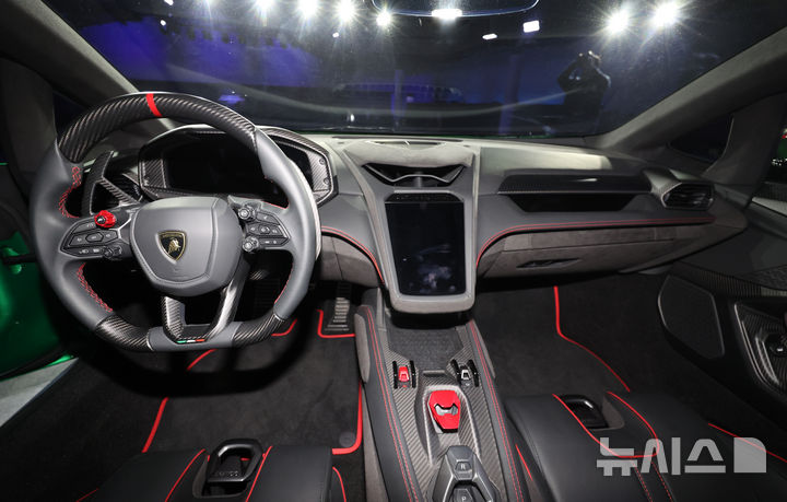 [서울=뉴시스] 김선웅 기자 = 6일 서울 광진구 파이팩토리 스튜디오에서 열린 람보르기니 신차 공개 행사에서 플러그인 하이브리드 슈퍼 스포츠카 '테메라리오(Temerario)'가 공개되고 있다. 2025.03.06. [email protected]