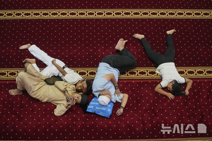[자카르타=AP/뉴시스] 7일(현지 시간) 인도네시아 자카르타의 이스티크랄 사원에서 라마단 금식성월 첫 금요 기도회를 마친 무슬림들이 사원 바닥에 누워 휴식하고 있다. 2025.03.07.