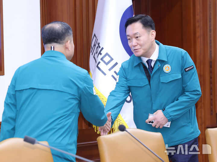 [서울=뉴시스] 조수정 기자 = 신상균(왼쪽) 국무조정실 대테러센터장과 이진하 대통령경호처 경비안전본부장이 7일 정부서울청사에서 열린 최상목 대통령 권한대행 부총리 겸 기획재정부 장관 주재 제20차 국가테러대책위원회에 참석해 인사나누고 있다. 2025.03.07. [email protected]