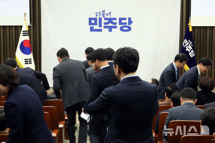 [서울=뉴시스] 고승민 기자 = 법원이 윤석열 대통령의 구속 취소를 인용한 7일 서울 여의도 국회에서 더불어민주당 의원들이 긴급 의원총회를 위해 회의장으로 모이고 있다. 2025.03.07. [email protected]