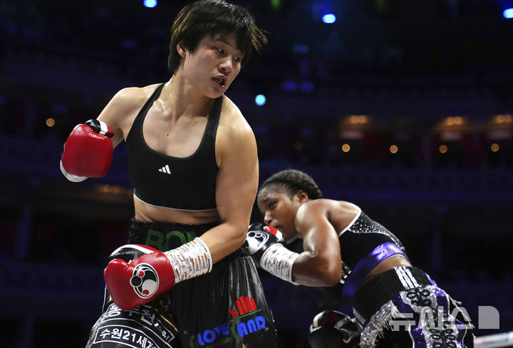 [런던=AP/뉴시스] 신보미레(왼쪽)가 7일(현지 시간) 영국 런던 로열 앨버트 홀에서 열린 세계복싱평의회(WBC) 라이트급 타이틀전에서 챔피언 캐롤라인 뒤부아(영국)와 경기하고 있다. 신보미레는 판정으로(95-95 93-98 92-98) 패해 타이틀 획득에 실패했다. 2025.03.08.