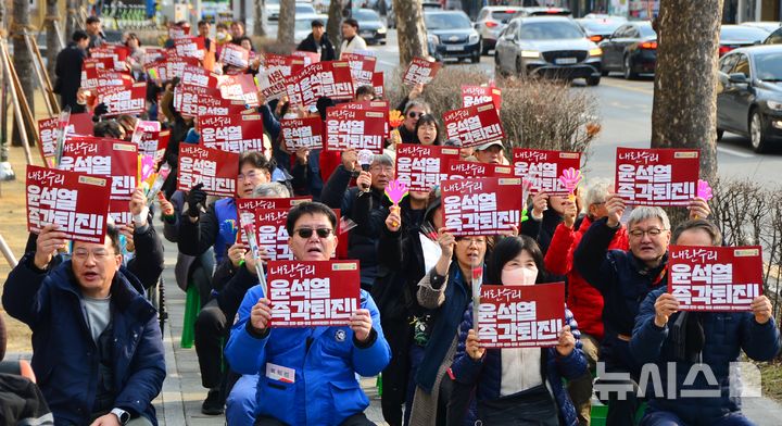 [청주=뉴시스] 서주영 기자 = 8일 충북도청 서문에서 진보 성향 단체가 집회를 열고 법원의 윤석열 대통령 구속 취소 결정을 규탄하고 있다. 2025.03.08. [email protected]