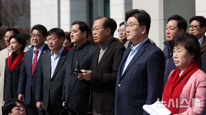 [서울=뉴시스] 홍효식 기자 = 권영세 국민의힘 비상대책위원장이 8일 서울 서초구 대검찰청 앞에서 열린 비상의원총회에서 발언하고 있다. 2025.03.08. [email protected]