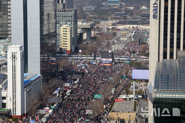 [서울=뉴시스] 김선웅 기자 = 윤석열 대통령에 대한 헌법재판소의 탄핵심판 선고가 임박한 8일 서울 세종대로 일대에서 친윤 성향 시민들이 집회를 열고 대통령 탄핵 기각을 촉구하고 있다. 2025.03.08. [email protected]
