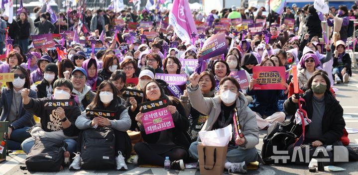 [서울=뉴시스] 김선웅 기자 = 8일 서울 종로구 광화문 인근에서 열린 3.8 세계여성의 날 기념 제40회 한국여성대회에서 참가 시민들이 성평등 민주주의를 촉구하고 있다. 2025.03.08 [email protected]