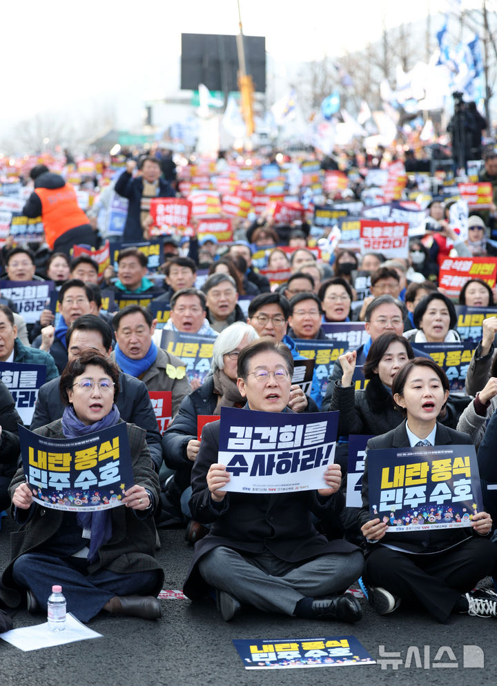 [서울=뉴시스] 김선웅 기자 = 이재명 더불어민주당 대표를 비롯한 야5당 관계자들이 윤석열 대통령에 대한 헌법재판소의 탄핵 심판 선고가 임박하고 대검찰청이 윤 대통령 구속 취소 즉시항고 포기 입장을 밝힌 8일 서울 종로구 안국역 인근에서 열린 야5당 공동 범국민대회에서 윤석열 대통령에 대한 탄핵 인용을 촉구하고 있다. 2025.03.08. [email protected]