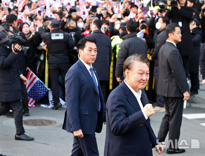 [서울=뉴시스] 김금보 기자 = 석방된 윤석열 대통령이 8일 오후 서울 용산구 한남동 관저 입구에서 지지자들에게 인사하고 있다. 2025.03.08. [email protected]