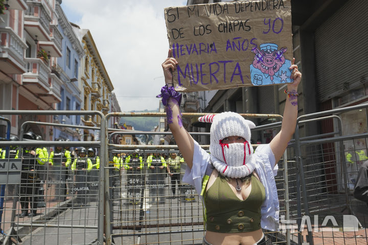 [키토=AP/뉴시스] 세계 여성의 날인 8일(현지 시간) 에콰도르 키토의 정부 청사 앞에서 한 여성이 "내 목숨이 경찰에 딸려 있었다면 난 오래전에 죽었을 것"이라고 쓰인 손팻말을 들고 경찰과 대치하고 있다. 2025.03.09.