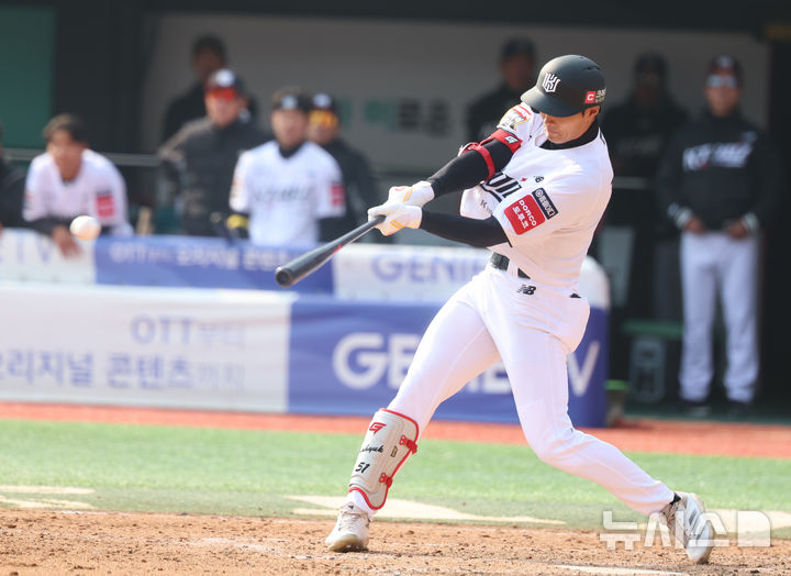 [수원=뉴시스] 이영환 기자 = 9일 오후 수원 KT위즈파크에서 열린 2025 프로야구 LG 트윈스와 kt wiz의 시범경기, 7회말 2사 2,3루에서 kt 장진혁이 1타점 안타를 날리고 있다. 2025.03.09. [email protected]