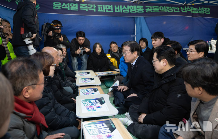[서울=뉴시스] 김명년 기자 = 이재명 더불어민주당 대표가 9일 오후 서울 종로구 경복궁역 인근에서 윤석열 대통령 파면을 촉구하며 단식 농성 중인 윤석열즉각퇴진·사회대개혁 비상행동 대표단을 찾아 대화하고 있다. (공동취재) 2025.03.09. [email protected]