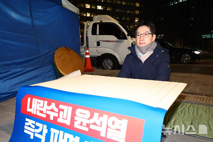 [서울=뉴시스] 김근수 기자 = 김경수 전 경남지사가 9일 저녁 서울 종로구 경복궁역 인근에서 윤석열 대통령 파면을 촉구하는 단식 농성을 하고 있다. 2025.03.09. [email protected]