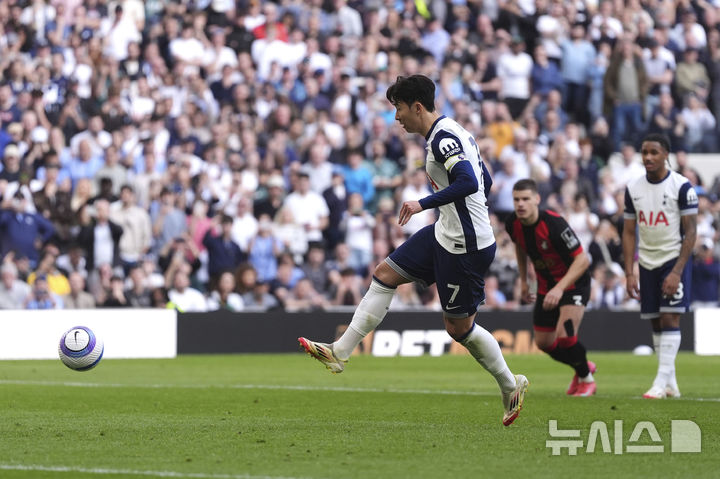 [런던=AP/뉴시스] 토트넘 홋스퍼의 손흥민이 9일(현지 시간) 영국 런던 토트넘 홋스퍼 스타디움에서 열린 224-25 프리미어리그 28라운드 본머스와 경기 후반 37분 페널티킥(PK)으로 동점 골을 넣고 있다. 손흥민은 리그 7호를 기록하며 팀을 패배에서 구했고 토트넘은 2-2로 비겼다. 2025.03.10.