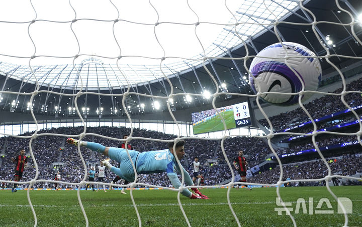 [런던=AP/뉴시스] 토트넘 홋스퍼의 파페 사르가 9일(현지 시간) 영국 런던 토트넘 홋스퍼 스타디움에서 열린 224-25 프리미어리그 28라운드 본머스와 경기 후반 22분 추격 골을 넣고 있다. 토트넘은 이후 손흥민의 페널티킥(PK) 동점 골로 2-2로 비겼다. 2025.03.10.