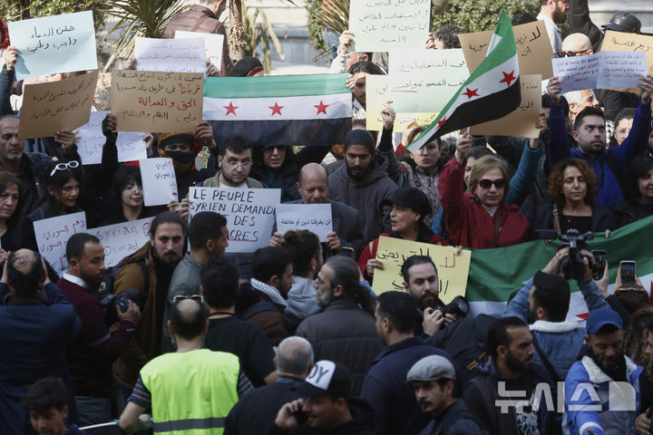 [다마스쿠스=AP/뉴시스] 9일(현지 시간) 시리아 다마스쿠스에서 시위대가 최근 시리아 해안 지역에서 인명 피해를 초래한 무력 충돌에 반대하는 시위를 벌이고 있다. 아메드 알샤라 시리아 과도정부 대통령은 "최근 사태는 전 정권 잔여 세력과 이들을 지원하는 외세 개입 탓"이라며 "이번 전투와 인명 피해 책임자를 색출해 예외 없이 처벌할 것"이라고 밝혔다. 2025.03.10.
