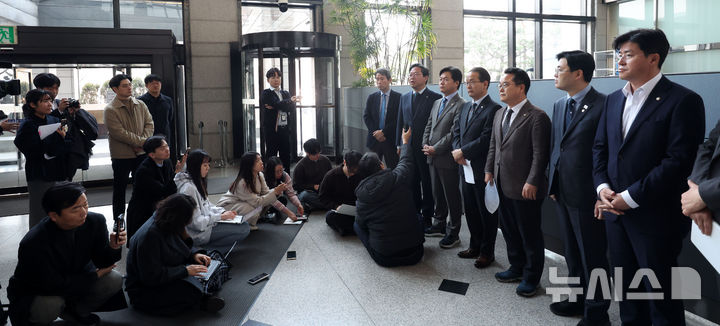 [서울=뉴시스] 김선웅 기자 = 국회 정무위원회 더불어민주당 소속 김승원(왼쪽 두 번째) 의원, 강준현(왼쪽 네 번째) 간사 등 국회의원들이 10일 서울 여의도 금융감독원에서 삼부토건 주가조작 관련 조사를 촉구하기 위해 항의 방문하며 입장을 말하고 있다. 2025.03.10 [email protected]