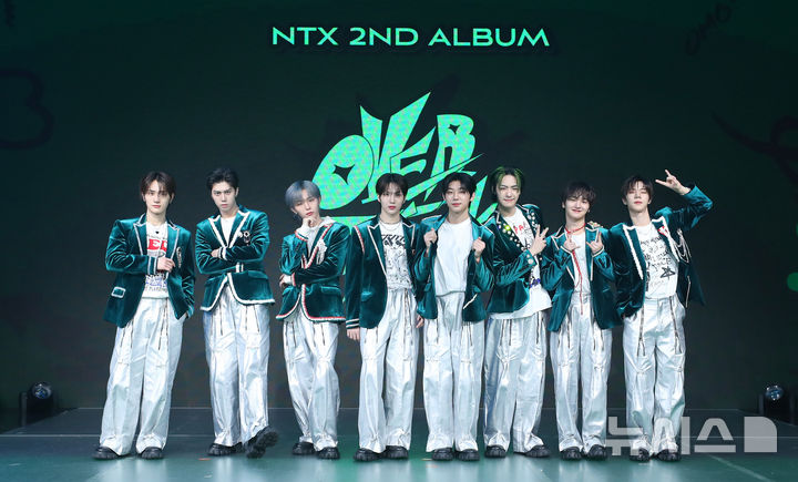 [서울=뉴시스] 김혜진 기자 = 그룹 NTX(왼쪽부터 형진, 윤혁, 시하, 창훈, 호준, 로현, 은호, 승원)가 10일 오전 서울 마포구 쇼킹케이팝센터에서 열린 두 번째 정규앨범 '오버 트랙' 발매 기념 쇼케이스에서 포즈를 취하고 있다. 2025.03.10. [email protected]