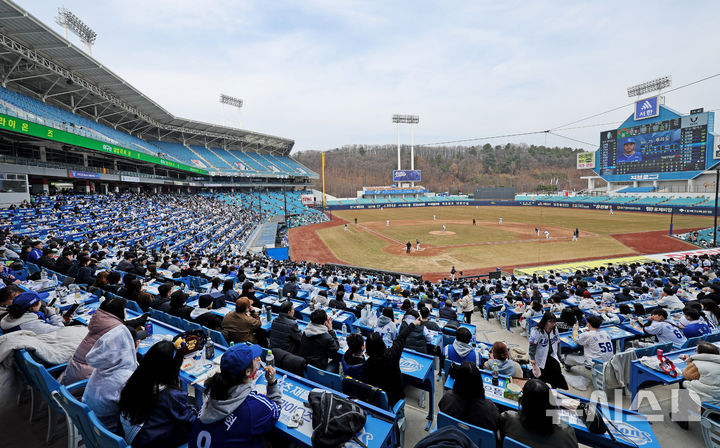 [대구=뉴시스] 이무열 기자 = 10일 대구 수성구 삼성라이온즈파크에서 열린 프로야구 ‘2025 신한 SOL 뱅크 KBO 리그’ 두산 베어스와 삼성 라이온즈의 시범경기, 삼성 팬들이 경기를 지켜보고 있다. 2025.03.10. [email protected]