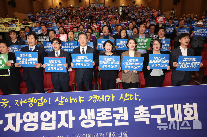 [서울=뉴시스] 고승민 기자 = 이재명 더불어민주당 대표, 김선민 조국혁신당 대표 권한대행, 김재연 진보당 상임대표, 용혜인 기본소득당 대표, 한창민 사회민주당 대표가 10일 서울 여의도 국회 의원회관에서 열린 중소상공인, 자영업자 생존권 촉구대회에서 참석자들과 함께 피켓을 들고 구호를 외치며 기념촬영하고 있다. 2025.03.10. [email protected]