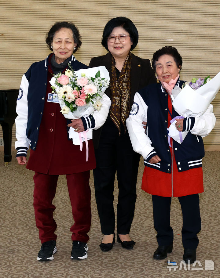 [서울=뉴시스] 박주성 기자 = 10일 오후 서울 용산구 숙명여자대학교 백주년기념관에서 열린 미래교육원 입학식에서 최고령 입학생인 김갑녀(오른쪽), 모부덕 할머니가 학교 점퍼를 입고 문시연 총장과 기념촬영을 하고 있다. 2025.03.10. [email protected]