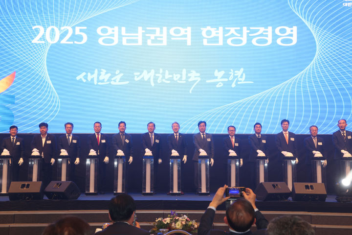 [서울=뉴시스] 이영환 기자 = 강호동(왼쪽 일곱 번째) 농협중앙회장 등이 10일 경남 창원시 성산구 창원컨벤션센터에서 열린 영남권역(경북,경남,부산,대구,울산) 지역본부 현장경영에서 개막 퍼포먼스를 하고 있다. (사진=농협중앙회 제공) 2025.03.10. [email protected] *재판매 및 DB 금지