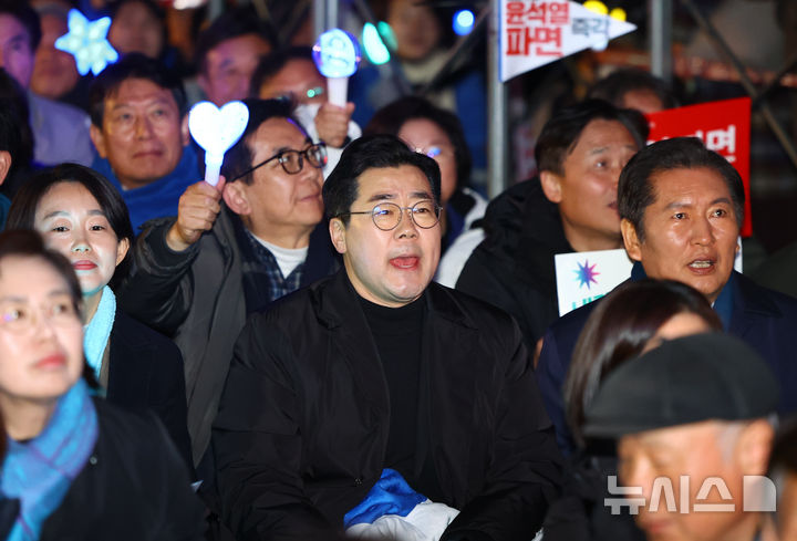 [서울=뉴시스] 황준선 기자 = 박찬대 더불어민주당 원내대표가 10일 오후 서울 종로구 경복궁 앞에서 열린 윤석열즉각퇴진·사회대개혁 비상행동 주최 윤석열 대통령 탄핵 촉구 집회에 참석해 구호를 외치고 있다. 2025.03.10. [email protected]