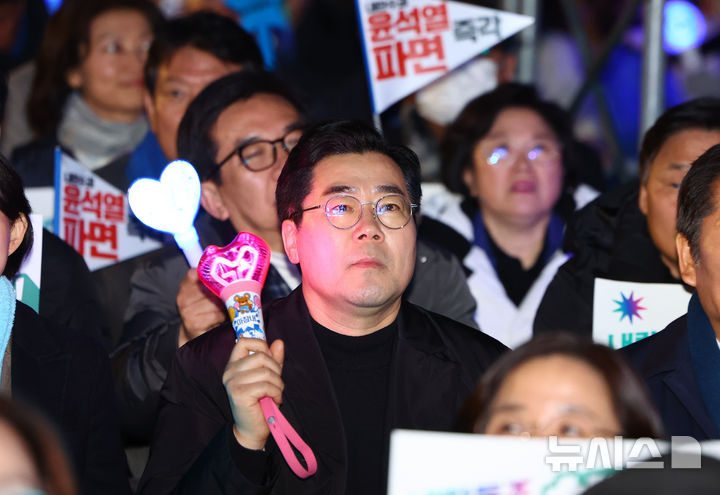 [서울=뉴시스] 황준선 기자 = 박찬대 더불어민주당 원내대표가 10일 오후 서울 종로구 경복궁 앞에서 열린 윤석열즉각퇴진·사회대개혁 비상행동 주최 윤석열 대통령 탄핵 촉구 집회에 참석해 응원봉을 흔들고 있다. 2025.03.10. [email protected]