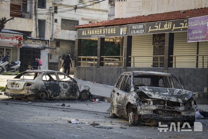 [자블라=AP/뉴시스] 10일(현지 시간) 시리아 해안 지역 자블라에서 최근 발생한 시리아 과도정부 보안군과 바샤르 알아사드 잔당과의 충돌 여파로 거리에 불에 탄 차량 잔해가 남아 있다. 2025.03.11.