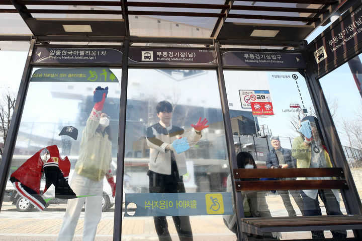 [광주=뉴시스] 박기웅 기자 = 11일 오전 광주 북구 임동행정복지센터 직원들이 프로야구 KIA타이거즈 시범 경기를 앞두고 광주기아챔피언스필드 인근 버스승강장에서 봄 맞이 청소를 하고 있다. 북구는 이달 말까지 관내 취약지 등을 대상으로 환경 정화활동을 펼친다. (사진 = 광주 북구 제공) 2025.03.11. [email protected]