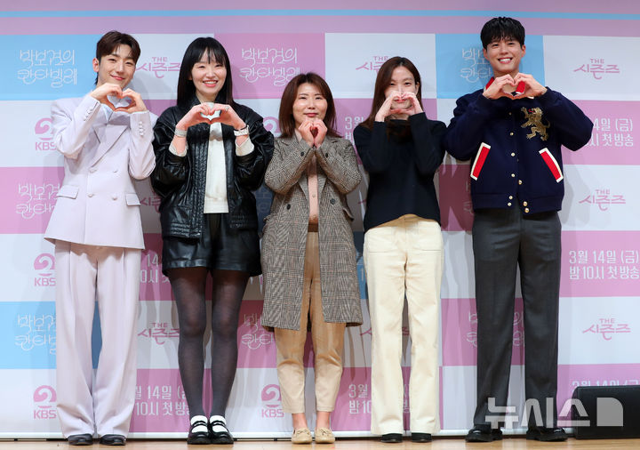 [서울=뉴시스] 김혜진 기자 = 멜로망스 정동환(왼쪽부터), 최승희PD, 최지나PD, 손자연PD, 박보검이 11일 오후 서울 영등포구 여의도 KBS아트홀에서 진행된 KBS2 음악 프로그램 '더 시즌즈 - 박보검의 칸타빌레' 제작발표회에서 포즈를 취하고 있다.