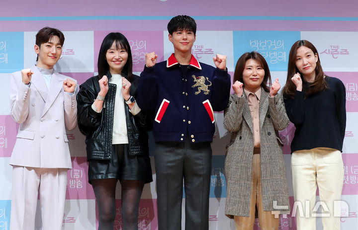 [서울=뉴시스] 김혜진 기자 = 멜로망스 정동환(왼쪽부터), 최승희PD, 박보검, 최지나PD, 손자연PD가 11일 오후 서울 영등포구 여의도 KBS아트홀에서 진행된 KBS2 음악 프로그램 '더 시즌즈 - 박보검의 칸타빌레' 제작발표회에서 포즈를 취하고 있다.