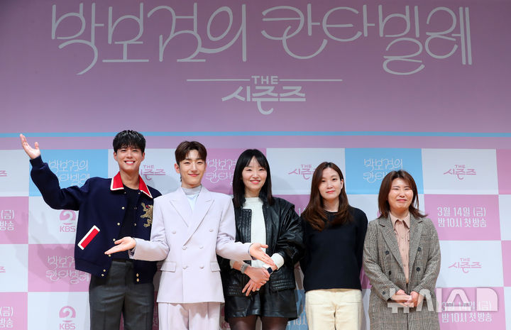 [서울=뉴시스] 김혜진 기자 = 배우 박보검(왼쪽부터), 멜로망스 정동환, 최승희PD, 손자연PD, 최지나PD가 11일 오후 서울 영등포구 여의도 KBS아트홀에서 진행된 KBS2 음악 프로그램 '더 시즌즈 - 박보검의 칸타빌레' 제작발표회에서 포즈를 취하고 있다.
