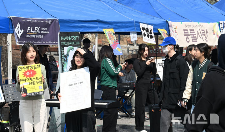 [인천=뉴시스] 전진환 기자 =  11일 오전 인천 미추홀구 인천대학교 교정에서 열린 동아리 신입회원 모집 행사에서 각 동아리 관계자들이 부스 홍보를 하고 있다. 2025.03.11. [email protected]