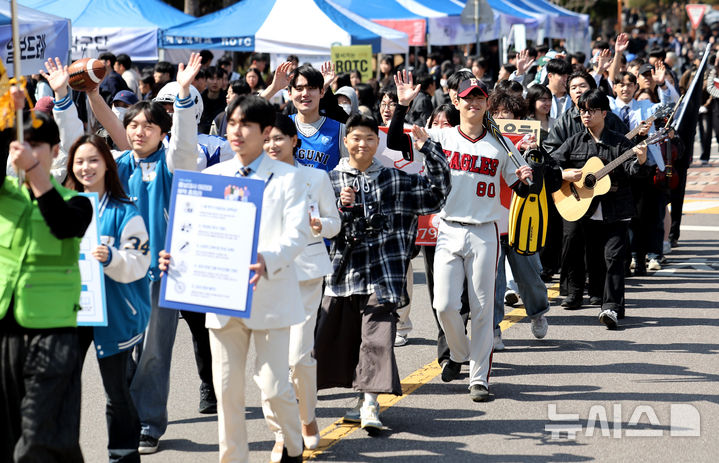 [대구=뉴시스] 이무열 기자 = 11일 대구 달서구 계명대학교 성서캠퍼스에서 열린 ‘2025학년도 1학기 총동아리연합회 신입생 가두모집’에 참여한 동아리 회원들이 캠퍼스를 행진하며 홍보활동을 펼치고 있다. 2025.03.11. [email protected]