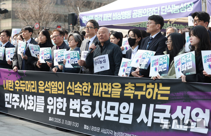 [서울=뉴시스] 김진아 기자 = 민주사회를 위한 변호사모임 관계자들이 11일 서울 광화문 서십자각 농성장 앞에서 윤석열 대통령 파면을 촉구하며 시국선언을 하고 있다. 2025.03.11. [email protected]
