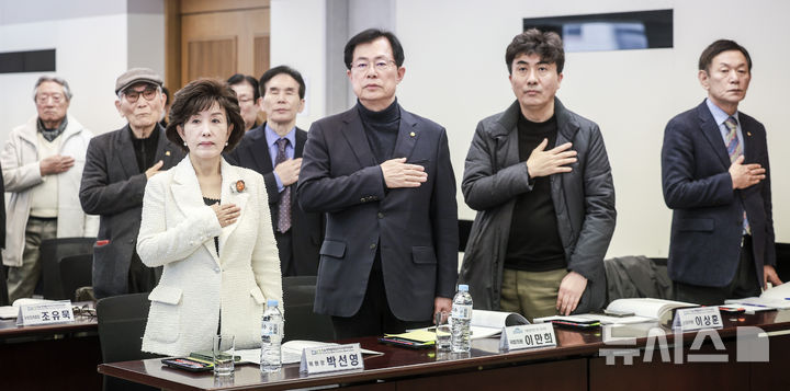 [서울=뉴시스] 정병혁 기자 = 박선영 진실화해위원장이 11일 서울 중구 프레스센터에서 열린 3·15의거 제65주년 기념 학술 심포지엄에서 국민의례를 하고 있다. 2025.03.11. [email protected]