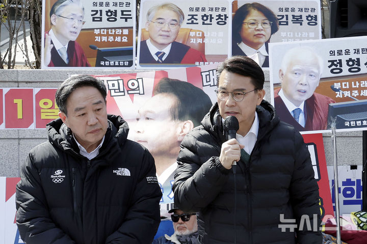 [서울=뉴시스] 최동준 기자 = 국민의힘 윤상현, 강승규 의원이 11일 서울 종로구 헌법재판소 앞에서 윤석열 대통령 탄핵 각하 촉구 릴레이 시위에 앞서 기자회견을 하고 있다. 2025.03.11. [email protected]
