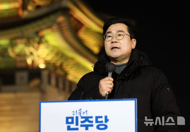 [서울=뉴시스] 홍효식 기자 = 박찬대 더불어민주당 원내대표가 11일 오후 서울 종로구 광화문 인근에서 열린 의원총회에서 윤석열 대통령 탄핵을 촉구하는 릴레이 규탄 발언을 하고 있다. 2025.03.11. [email protected]