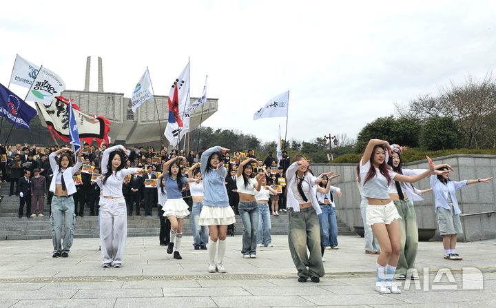 [광주=뉴시스] 이영주 기자 = 조선대·전남여고 재학생들이 12일 오전 광주 북구 운정동 국립5·18민주묘지에서 열린 제45주년 5·18민중항쟁기념행사위원회 출범식에 참여해 '다시 만난 세계' 노래에 맞춰 춤을 추고 있다. (사진 = 제45주년 5·18민중항쟁기념행사위원회 제공) 2025.03.12. [email protected]