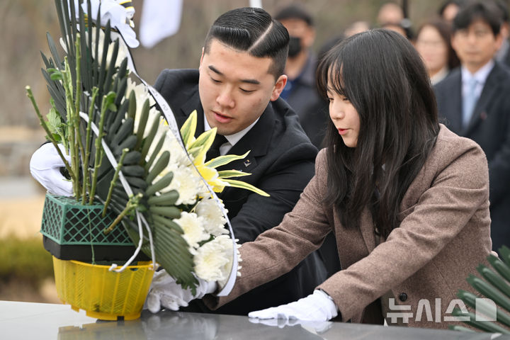 [광주=뉴시스] 이영주 기자 = 임채효(왼쪽) 조선대학교 총학생회장과 김나영 광주고등학생의회 부의장이 12일 오전 광주 북구 운정동 국립5·18민주묘지에서 열린 제45주년 5·18민중항쟁기념행사위원회 출범식에 참여해 오월 영령에 헌화하고 있다. 2025.03.12. [email protected]