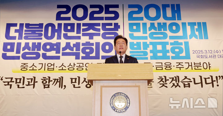 [서울=뉴시스] 조성우 기자 = 이재명 더불어민주당 대표가 12일 오전 서울 여의도 국회도서관 대강당에서 열린 2025 더불어민주당 민생연석회의 20대 민생의제 발표회에서 발언하고 있다. 2025.03.12. [email protected]