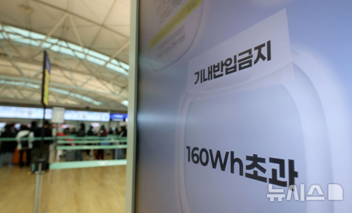 [인천공항=뉴시스] 김선웅 기자 = 12일 인천국제공항 출국장에서 기내 보조배터리 반입 관련 내용이 안내되고 있다.