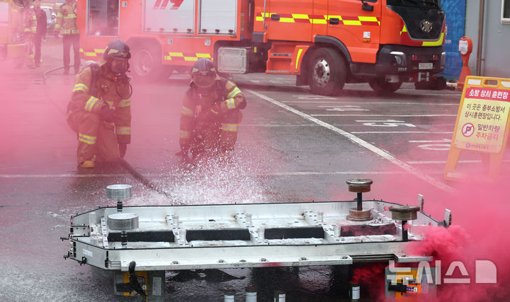 [인천=뉴시스] 전진환 기자 = 12일 오후 인천 중구 인천중부소방서에서 소방관들이 EV-드릴랜스(관통형 방사장치)’를 활용한 전기차 화재 진압훈련을 하고 있다. EV-드릴랜스는 전기차 화재 시 차량 아래쪽에서 배터리팩까지 직접구멍을 뚫고 물을 분사해 화재를 진압하는 장비다. 2025.03.12. [email protected]